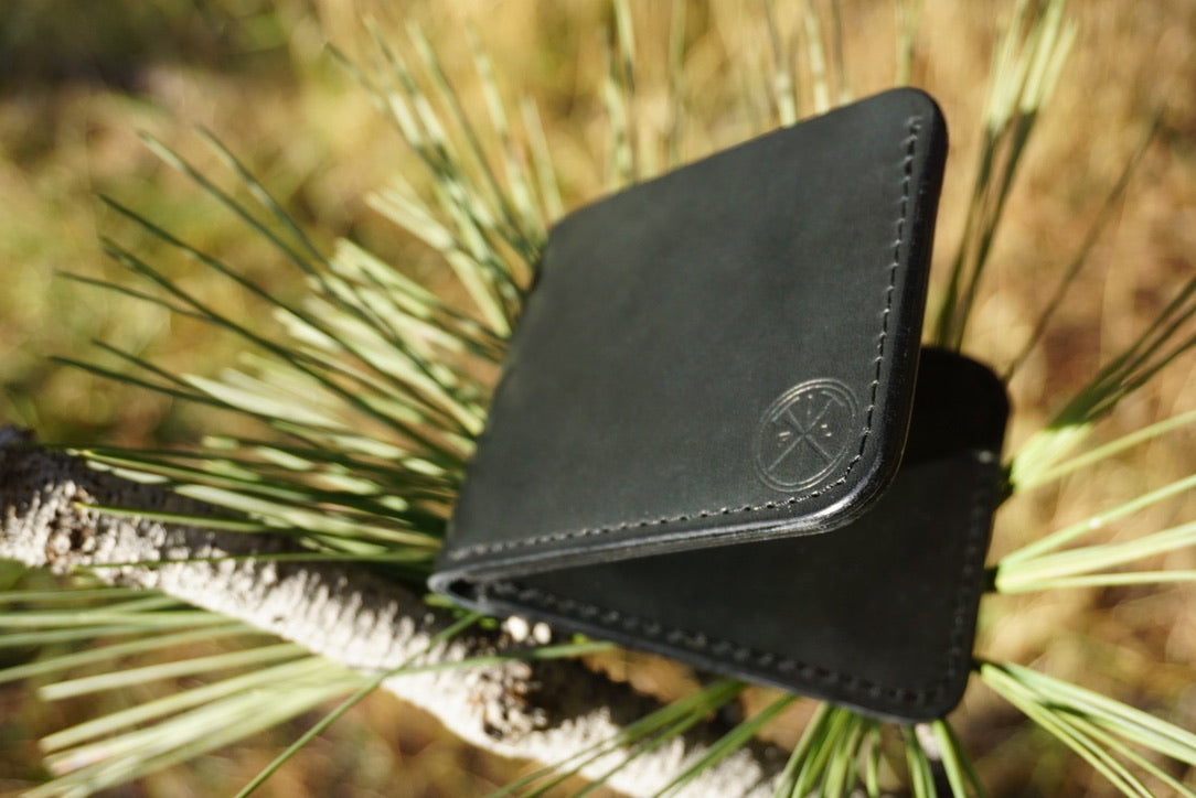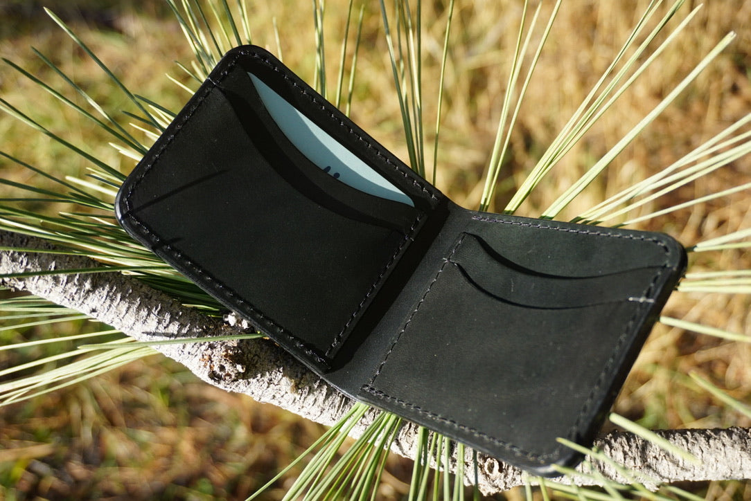 Our tried and true traditional bi-fold. Handmade from Wickett & Craig traditional harness leather. 4 card slots (each holds multiple cards) with a hidden slot under each side. Plenty of room for cash right where you'd expect it. Available in medium brown, olive green, and black.