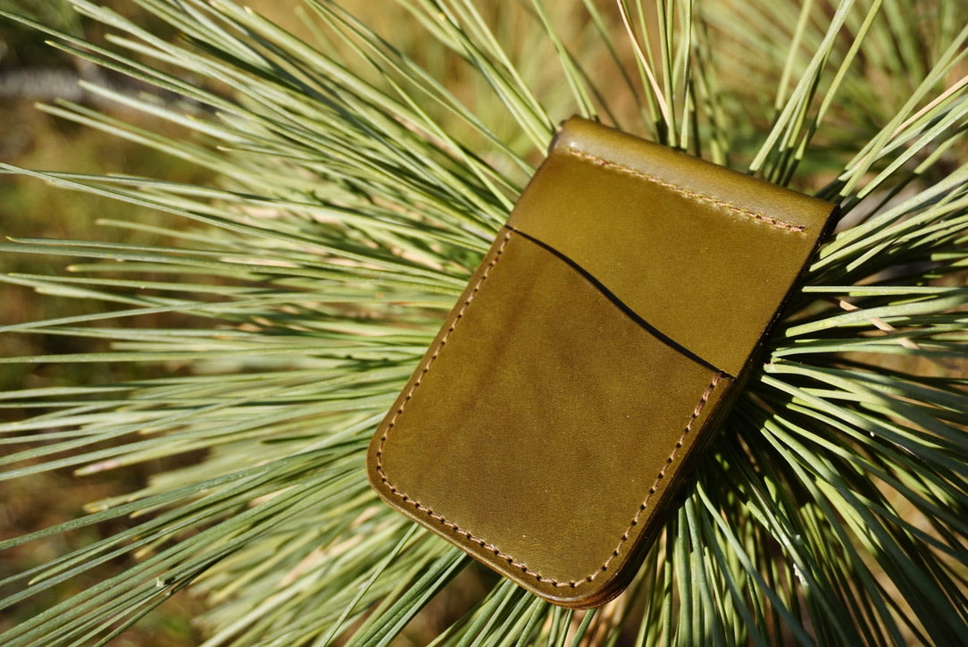 Small but mighty...if you're looking for a minimalist sized wallet with capacity for 8-12 cards + cash, this is the one. Each card pocket holds multiple cards, and the spring loaded money clip keeps cash secure. Simply click open the curved arm, insert cash, and click back in place for a secure hold. Easily fits in front pocket for an unobtrusive everyday carry. Hand made in-house using Wickett & Craig traditional harness leather.